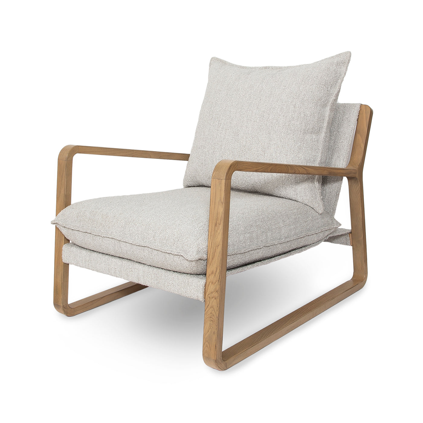 This chair is an instant classic. This midcentury-modern-inspired sling chair in fabulous and cozy boucle fabric was inspired by iconic retro design. The exposed oak colour wood frame and thick plush bouclé cushions create comfort and style like no other. These chairs are great for creating a warm and welcoming space in living rooms, bedrooms and family rooms.