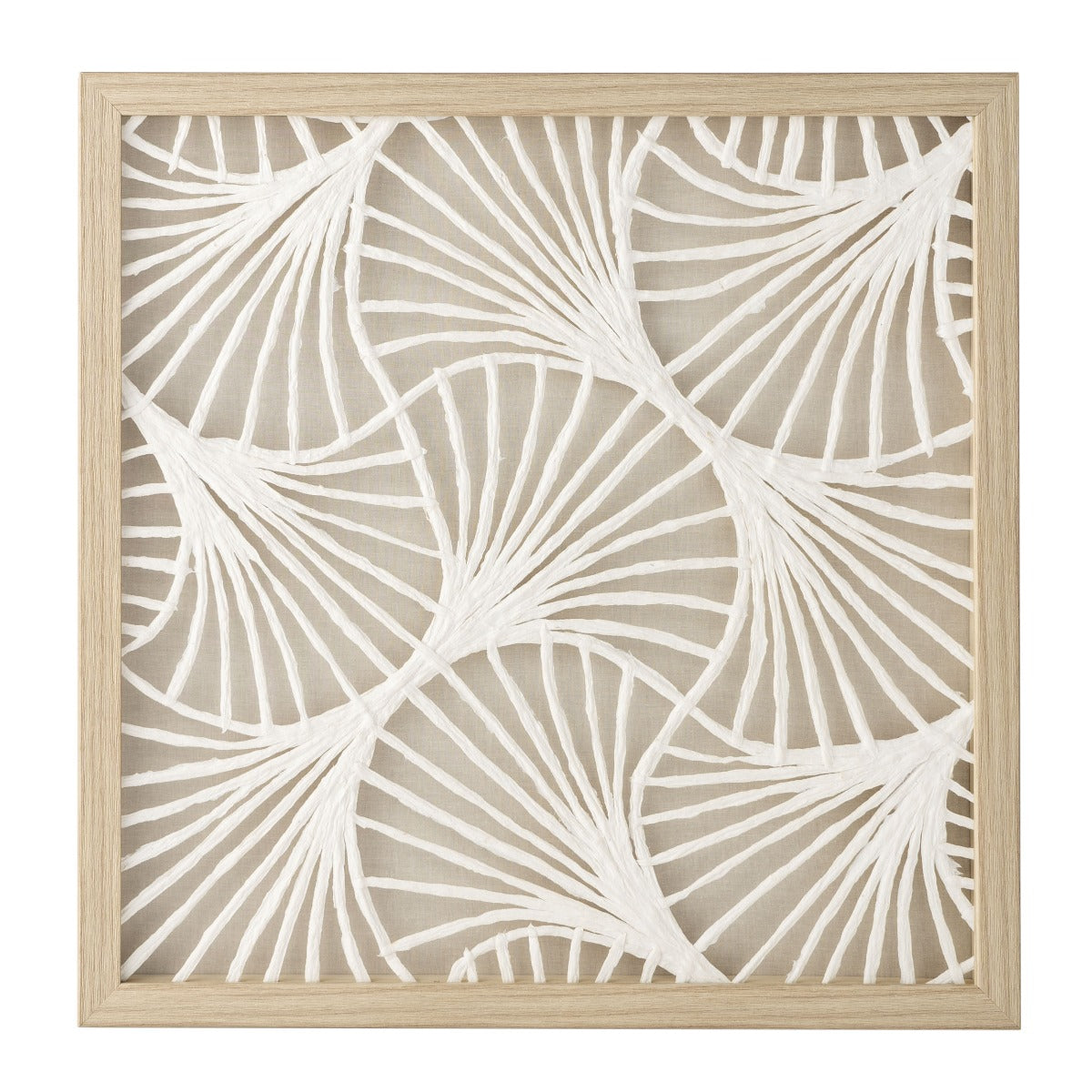 Refine your modern bohemian styled space with this impressive dimensional abstract shadow box. The natural elements and neutral colors make this a versatile and eye-catching piece of artwork that would work with any color palette. Featuring a light wood colored frame, this artwork is made using hand laid paper pulp in an intricate abstract pattern encased in glass. Beautiful on it's own or create a set for an impressive gallery wall.