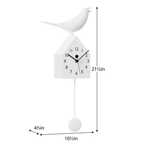 Dimensions: Total size. 10.5 x 4.25 x 21.5h". Bird + House size. 5 x 4 x 12.5h". Pendulum length. 9"