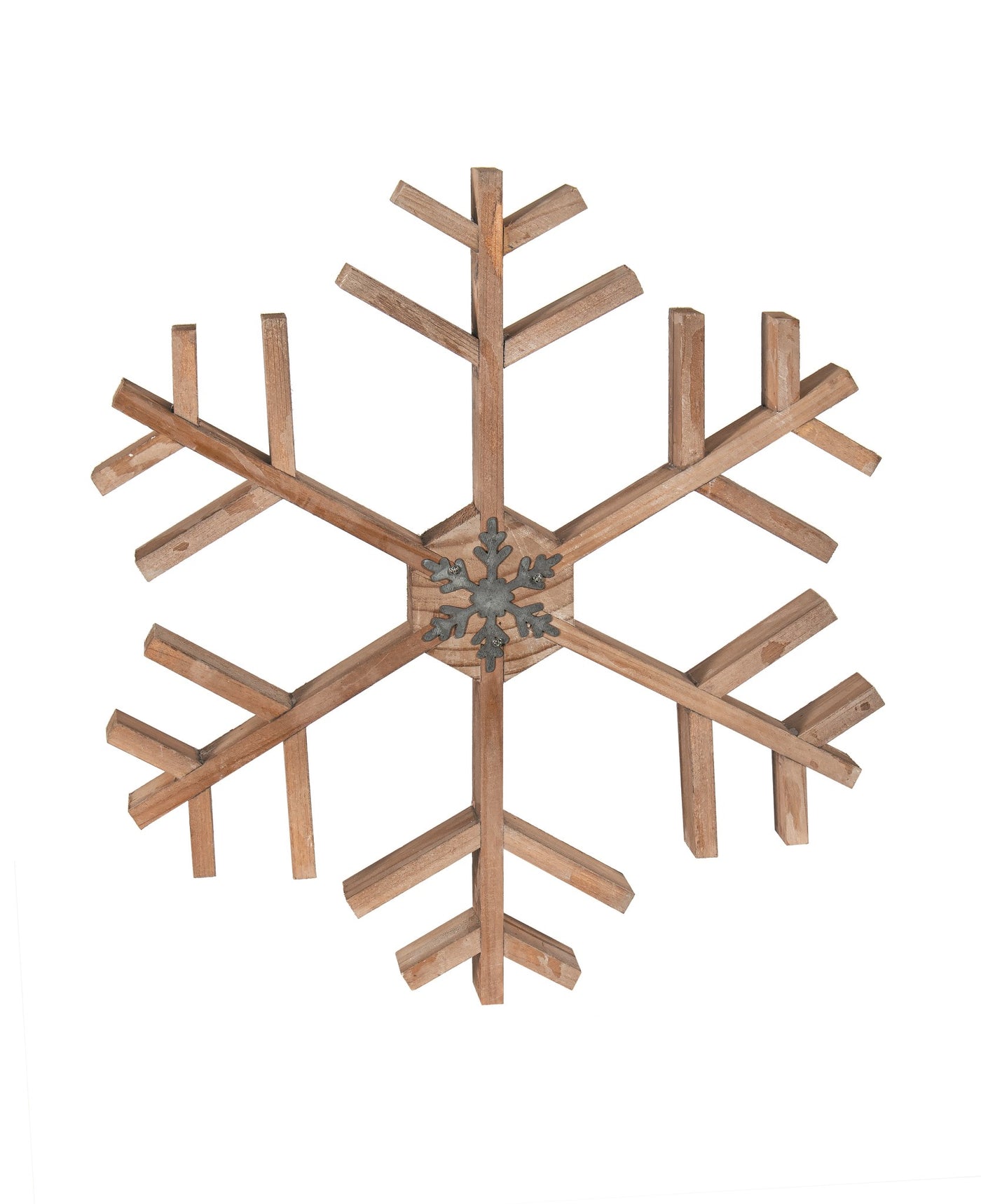 Small natural wood snowflake with silver metal applique. Can hang on the wall or stand alone on a shelf/table.