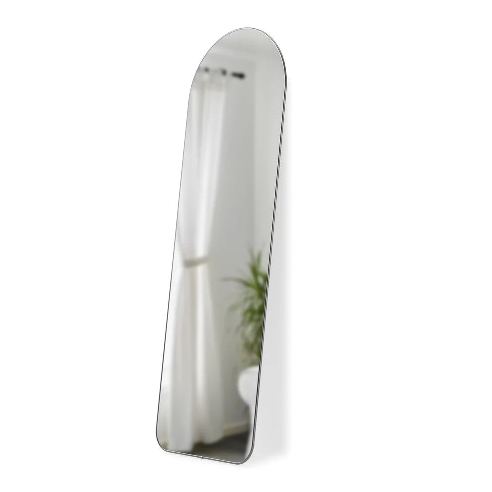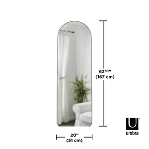 Elevate your space with the Hubba Arched Leaning Mirror, a modern take on the classic floor mirror. Its unique arch shape and thin metallic frame bring a soft, elegant touch to any room, while its large reflective surface brightens and visually expands your space. Perfect for entryways, bedrooms, or living areas, Hubba adds both style and function. Measuring 20.13 x 1.63 x 62.25 inches (51 x 4 x 158 cm), it can be securely wall-mounted or leaned against a wall with included anti-tip hardware. Please note: Hubba is designed for vertical display only and cannot be hung horizontally.