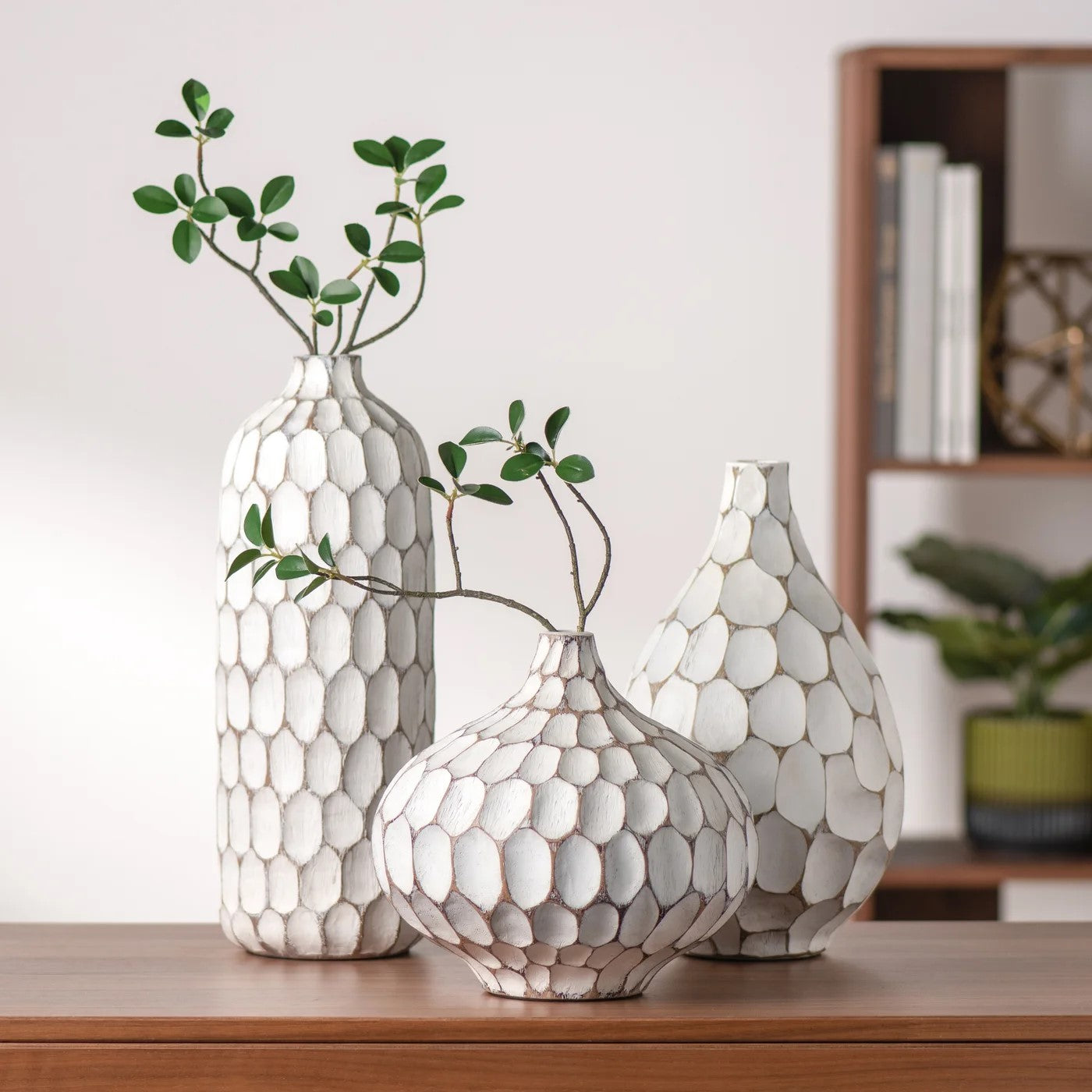 This resin vase features a carved wood-like texture with a whitewash finish, lending it a rustic farmhouse charm. Its teardrop shape adds a touch of whimsy, making it a versatile piece suitable for various decor settings. Perfect for shelves or tables, it effortlessly enhances any space with its earthy yet modern appeal. This resin vase is handmade, which may result in some variation in color, texture, and finish.
